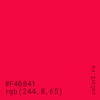 Цвет #F40841 в цветовой модели RGB обозначается тремя октетами (244, 8, 65) в десятичном формате и #F40841 в шестнадцатиричном (hex) формате, которые являются интенсивностью красного 244 (hex F4), интенсивность зелёного 8 (hex 08) и интенсивность синего 65 (hex 41).
