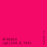 Цвет #F40868 в цветовой модели RGB обозначается тремя октетами (244, 8, 104) в десятичном формате и #F40868 в шестнадцатиричном (hex) формате, которые являются интенсивностью красного 244 (hex F4), интенсивность зелёного 8 (hex 08) и интенсивность синего 104 (hex 68).