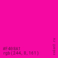 Цвет #F408A1 в цветовой модели RGB обозначается тремя октетами (244, 8, 161) в десятичном формате и #F408A1 в шестнадцатиричном (hex) формате, которые являются интенсивностью красного 244 (hex F4), интенсивность зелёного 8 (hex 08) и интенсивность синего 161 (hex A1).