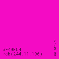Цвет #F40BC4 в цветовой модели RGB обозначается тремя октетами (244, 11, 196) в десятичном формате и #F40BC4 в шестнадцатиричном (hex) формате, которые являются интенсивностью красного 244 (hex F4), интенсивность зелёного 11 (hex 0B) и интенсивность синего 196 (hex C4).