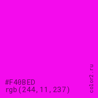 Цвет #F40BED в цветовой модели RGB обозначается тремя октетами (244, 11, 237) в десятичном формате и #F40BED в шестнадцатиричном (hex) формате, которые являются интенсивностью красного 244 (hex F4), интенсивность зелёного 11 (hex 0B) и интенсивность синего 237 (hex ED).