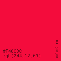 Цвет #F40C3C в цветовой модели RGB обозначается тремя октетами (244, 12, 60) в десятичном формате и #F40C3C в шестнадцатиричном (hex) формате, которые являются интенсивностью красного 244 (hex F4), интенсивность зелёного 12 (hex 0C) и интенсивность синего 60 (hex 3C).