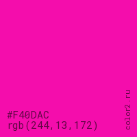 Цвет #F40DAC в цветовой модели RGB обозначается тремя октетами (244, 13, 172) в десятичном формате и #F40DAC в шестнадцатиричном (hex) формате, которые являются интенсивностью красного 244 (hex F4), интенсивность зелёного 13 (hex 0D) и интенсивность синего 172 (hex AC).