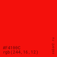 Цвет #F4100C в цветовой модели RGB обозначается тремя октетами (244, 16, 12) в десятичном формате и #F4100C в шестнадцатиричном (hex) формате, которые являются интенсивностью красного 244 (hex F4), интенсивность зелёного 16 (hex 10) и интенсивность синего 12 (hex 0C).