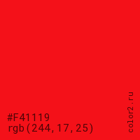Цвет #F41119 в цветовой модели RGB обозначается тремя октетами (244, 17, 25) в десятичном формате и #F41119 в шестнадцатиричном (hex) формате, которые являются интенсивностью красного 244 (hex F4), интенсивность зелёного 17 (hex 11) и интенсивность синего 25 (hex 19).