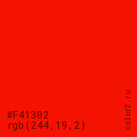 Цвет #F41302 в цветовой модели RGB обозначается тремя октетами (244, 19, 2) в десятичном формате и #F41302 в шестнадцатиричном (hex) формате, которые являются интенсивностью красного 244 (hex F4), интенсивность зелёного 19 (hex 13) и интенсивность синего 2 (hex 02).