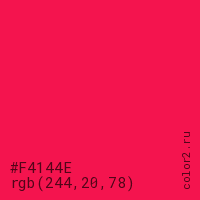 Цвет #F4144E в цветовой модели RGB обозначается тремя октетами (244, 20, 78) в десятичном формате и #F4144E в шестнадцатиричном (hex) формате, которые являются интенсивностью красного 244 (hex F4), интенсивность зелёного 20 (hex 14) и интенсивность синего 78 (hex 4E).
