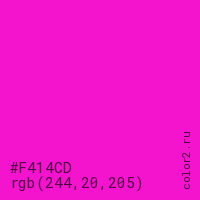 Цвет #F414CD в цветовой модели RGB обозначается тремя октетами (244, 20, 205) в десятичном формате и #F414CD в шестнадцатиричном (hex) формате, которые являются интенсивностью красного 244 (hex F4), интенсивность зелёного 20 (hex 14) и интенсивность синего 205 (hex CD).