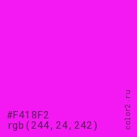 Цвет #F418F2 в цветовой модели RGB обозначается тремя октетами (244, 24, 242) в десятичном формате и #F418F2 в шестнадцатиричном (hex) формате, которые являются интенсивностью красного 244 (hex F4), интенсивность зелёного 24 (hex 18) и интенсивность синего 242 (hex F2).