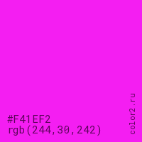Цвет #F41EF2 в цветовой модели RGB обозначается тремя октетами (244, 30, 242) в десятичном формате и #F41EF2 в шестнадцатиричном (hex) формате, которые являются интенсивностью красного 244 (hex F4), интенсивность зелёного 30 (hex 1E) и интенсивность синего 242 (hex F2).