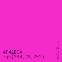 Цвет #F42BCA в цветовой модели RGB обозначается тремя октетами (244, 43, 202) в десятичном формате и #F42BCA в шестнадцатиричном (hex) формате, которые являются интенсивностью красного 244 (hex F4), интенсивность зелёного 43 (hex 2B) и интенсивность синего 202 (hex CA).