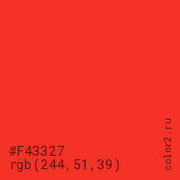 Цвет #F43327 в цветовой модели RGB обозначается тремя октетами (244, 51, 39) в десятичном формате и #F43327 в шестнадцатиричном (hex) формате, которые являются интенсивностью красного 244 (hex F4), интенсивность зелёного 51 (hex 33) и интенсивность синего 39 (hex 27).