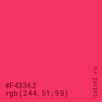 Цвет #F43362 в цветовой модели RGB обозначается тремя октетами (244, 51, 98) в десятичном формате и #F43362 в шестнадцатиричном (hex) формате, которые являются интенсивностью красного 244 (hex F4), интенсивность зелёного 51 (hex 33) и интенсивность синего 98 (hex 62).