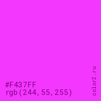 Цвет #F437FF в цветовой модели RGB обозначается тремя октетами (244, 55, 255) в десятичном формате и #F437FF в шестнадцатиричном (hex) формате, которые являются интенсивностью красного 244 (hex F4), интенсивность зелёного 55 (hex 37) и интенсивность синего 255 (hex FF).