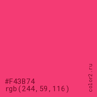 Цвет #F43B74 в цветовой модели RGB обозначается тремя октетами (244, 59, 116) в десятичном формате и #F43B74 в шестнадцатиричном (hex) формате, которые являются интенсивностью красного 244 (hex F4), интенсивность зелёного 59 (hex 3B) и интенсивность синего 116 (hex 74).
