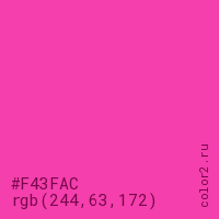 Цвет #F43FAC в цветовой модели RGB обозначается тремя октетами (244, 63, 172) в десятичном формате и #F43FAC в шестнадцатиричном (hex) формате, которые являются интенсивностью красного 244 (hex F4), интенсивность зелёного 63 (hex 3F) и интенсивность синего 172 (hex AC).