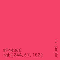 Цвет #F44366 в цветовой модели RGB обозначается тремя октетами (244, 67, 102) в десятичном формате и #F44366 в шестнадцатиричном (hex) формате, которые являются интенсивностью красного 244 (hex F4), интенсивность зелёного 67 (hex 43) и интенсивность синего 102 (hex 66).