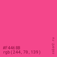 Цвет #F4468B в цветовой модели RGB обозначается тремя октетами (244, 70, 139) в десятичном формате и #F4468B в шестнадцатиричном (hex) формате, которые являются интенсивностью красного 244 (hex F4), интенсивность зелёного 70 (hex 46) и интенсивность синего 139 (hex 8B).
