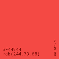 Цвет #F44944 в цветовой модели RGB обозначается тремя октетами (244, 73, 68) в десятичном формате и #F44944 в шестнадцатиричном (hex) формате, которые являются интенсивностью красного 244 (hex F4), интенсивность зелёного 73 (hex 49) и интенсивность синего 68 (hex 44).