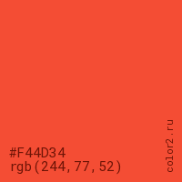 Цвет #F44D34 в цветовой модели RGB обозначается тремя октетами (244, 77, 52) в десятичном формате и #F44D34 в шестнадцатиричном (hex) формате, которые являются интенсивностью красного 244 (hex F4), интенсивность зелёного 77 (hex 4D) и интенсивность синего 52 (hex 34).