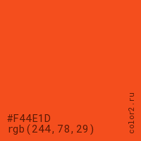 Цвет #F44E1D в цветовой модели RGB обозначается тремя октетами (244, 78, 29) в десятичном формате и #F44E1D в шестнадцатиричном (hex) формате, которые являются интенсивностью красного 244 (hex F4), интенсивность зелёного 78 (hex 4E) и интенсивность синего 29 (hex 1D).