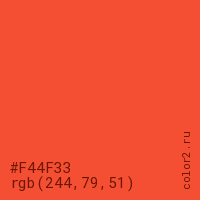 Цвет #F44F33 в цветовой модели RGB обозначается тремя октетами (244, 79, 51) в десятичном формате и #F44F33 в шестнадцатиричном (hex) формате, которые являются интенсивностью красного 244 (hex F4), интенсивность зелёного 79 (hex 4F) и интенсивность синего 51 (hex 33).