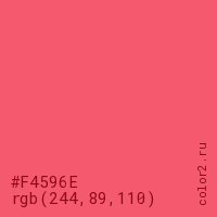 Цвет #F4596E в цветовой модели RGB обозначается тремя октетами (244, 89, 110) в десятичном формате и #F4596E в шестнадцатиричном (hex) формате, которые являются интенсивностью красного 244 (hex F4), интенсивность зелёного 89 (hex 59) и интенсивность синего 110 (hex 6E).