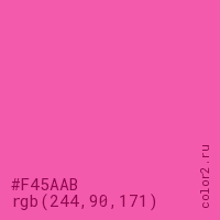 Цвет #F45AAB в цветовой модели RGB обозначается тремя октетами (244, 90, 171) в десятичном формате и #F45AAB в шестнадцатиричном (hex) формате, которые являются интенсивностью красного 244 (hex F4), интенсивность зелёного 90 (hex 5A) и интенсивность синего 171 (hex AB).