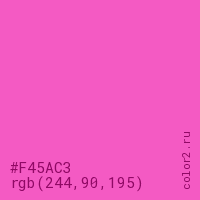 Цвет #F45AC3 в цветовой модели RGB обозначается тремя октетами (244, 90, 195) в десятичном формате и #F45AC3 в шестнадцатиричном (hex) формате, которые являются интенсивностью красного 244 (hex F4), интенсивность зелёного 90 (hex 5A) и интенсивность синего 195 (hex C3).