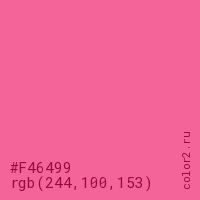 Цвет #F46499 в цветовой модели RGB обозначается тремя октетами (244, 100, 153) в десятичном формате и #F46499 в шестнадцатиричном (hex) формате, которые являются интенсивностью красного 244 (hex F4), интенсивность зелёного 100 (hex 64) и интенсивность синего 153 (hex 99).