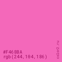 Цвет #F468BA в цветовой модели RGB обозначается тремя октетами (244, 104, 186) в десятичном формате и #F468BA в шестнадцатиричном (hex) формате, которые являются интенсивностью красного 244 (hex F4), интенсивность зелёного 104 (hex 68) и интенсивность синего 186 (hex BA).