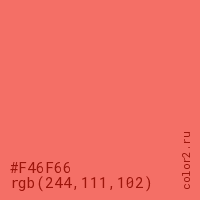 Цвет #F46F66 в цветовой модели RGB обозначается тремя октетами (244, 111, 102) в десятичном формате и #F46F66 в шестнадцатиричном (hex) формате, которые являются интенсивностью красного 244 (hex F4), интенсивность зелёного 111 (hex 6F) и интенсивность синего 102 (hex 66).