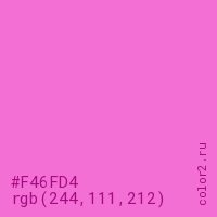 Цвет #F46FD4 в цветовой модели RGB обозначается тремя октетами (244, 111, 212) в десятичном формате и #F46FD4 в шестнадцатиричном (hex) формате, которые являются интенсивностью красного 244 (hex F4), интенсивность зелёного 111 (hex 6F) и интенсивность синего 212 (hex D4).
