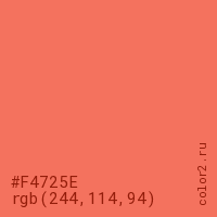 Цвет #F4725E в цветовой модели RGB обозначается тремя октетами (244, 114, 94) в десятичном формате и #F4725E в шестнадцатиричном (hex) формате, которые являются интенсивностью красного 244 (hex F4), интенсивность зелёного 114 (hex 72) и интенсивность синего 94 (hex 5E).