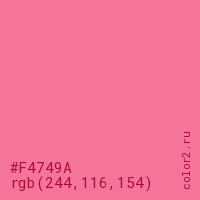 Цвет #F4749A в цветовой модели RGB обозначается тремя октетами (244, 116, 154) в десятичном формате и #F4749A в шестнадцатиричном (hex) формате, которые являются интенсивностью красного 244 (hex F4), интенсивность зелёного 116 (hex 74) и интенсивность синего 154 (hex 9A).