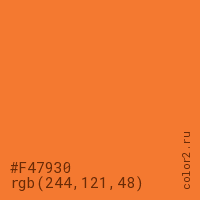 Цвет #F47930 в цветовой модели RGB обозначается тремя октетами (244, 121, 48) в десятичном формате и #F47930 в шестнадцатиричном (hex) формате, которые являются интенсивностью красного 244 (hex F4), интенсивность зелёного 121 (hex 79) и интенсивность синего 48 (hex 30).