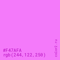 Цвет #F47AFA в цветовой модели RGB обозначается тремя октетами (244, 122, 250) в десятичном формате и #F47AFA в шестнадцатиричном (hex) формате, которые являются интенсивностью красного 244 (hex F4), интенсивность зелёного 122 (hex 7A) и интенсивность синего 250 (hex FA).