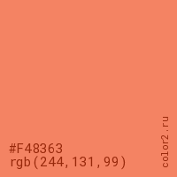 Цвет #F48363 в цветовой модели RGB обозначается тремя октетами (244, 131, 99) в десятичном формате и #F48363 в шестнадцатиричном (hex) формате, которые являются интенсивностью красного 244 (hex F4), интенсивность зелёного 131 (hex 83) и интенсивность синего 99 (hex 63).