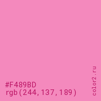 Цвет #F489BD в цветовой модели RGB обозначается тремя октетами (244, 137, 189) в десятичном формате и #F489BD в шестнадцатиричном (hex) формате, которые являются интенсивностью красного 244 (hex F4), интенсивность зелёного 137 (hex 89) и интенсивность синего 189 (hex BD).