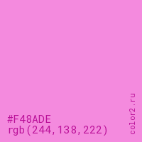 Цвет #F48ADE в цветовой модели RGB обозначается тремя октетами (244, 138, 222) в десятичном формате и #F48ADE в шестнадцатиричном (hex) формате, которые являются интенсивностью красного 244 (hex F4), интенсивность зелёного 138 (hex 8A) и интенсивность синего 222 (hex DE).