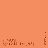 Цвет #F48D5F в цветовой модели RGB обозначается тремя октетами (244, 141, 95) в десятичном формате и #F48D5F в шестнадцатиричном (hex) формате, которые являются интенсивностью красного 244 (hex F4), интенсивность зелёного 141 (hex 8D) и интенсивность синего 95 (hex 5F).