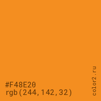 Цвет #F48E20 в цветовой модели RGB обозначается тремя октетами (244, 142, 32) в десятичном формате и #F48E20 в шестнадцатиричном (hex) формате, которые являются интенсивностью красного 244 (hex F4), интенсивность зелёного 142 (hex 8E) и интенсивность синего 32 (hex 20).
