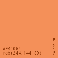 Цвет #F49059 в цветовой модели RGB обозначается тремя октетами (244, 144, 89) в десятичном формате и #F49059 в шестнадцатиричном (hex) формате, которые являются интенсивностью красного 244 (hex F4), интенсивность зелёного 144 (hex 90) и интенсивность синего 89 (hex 59).