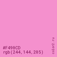 Цвет #F490CD в цветовой модели RGB обозначается тремя октетами (244, 144, 205) в десятичном формате и #F490CD в шестнадцатиричном (hex) формате, которые являются интенсивностью красного 244 (hex F4), интенсивность зелёного 144 (hex 90) и интенсивность синего 205 (hex CD).