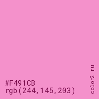 Цвет #F491CB в цветовой модели RGB обозначается тремя октетами (244, 145, 203) в десятичном формате и #F491CB в шестнадцатиричном (hex) формате, которые являются интенсивностью красного 244 (hex F4), интенсивность зелёного 145 (hex 91) и интенсивность синего 203 (hex CB).