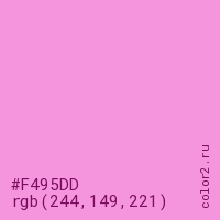 Цвет #F495DD в цветовой модели RGB обозначается тремя октетами (244, 149, 221) в десятичном формате и #F495DD в шестнадцатиричном (hex) формате, которые являются интенсивностью красного 244 (hex F4), интенсивность зелёного 149 (hex 95) и интенсивность синего 221 (hex DD).