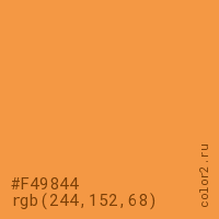 Цвет #F49844 в цветовой модели RGB обозначается тремя октетами (244, 152, 68) в десятичном формате и #F49844 в шестнадцатиричном (hex) формате, которые являются интенсивностью красного 244 (hex F4), интенсивность зелёного 152 (hex 98) и интенсивность синего 68 (hex 44).