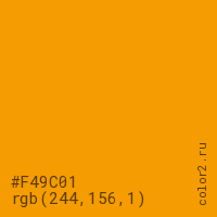 Цвет #F49C01 в цветовой модели RGB обозначается тремя октетами (244, 156, 1) в десятичном формате и #F49C01 в шестнадцатиричном (hex) формате, которые являются интенсивностью красного 244 (hex F4), интенсивность зелёного 156 (hex 9C) и интенсивность синего 1 (hex 01).