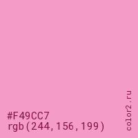 Цвет #F49CC7 в цветовой модели RGB обозначается тремя октетами (244, 156, 199) в десятичном формате и #F49CC7 в шестнадцатиричном (hex) формате, которые являются интенсивностью красного 244 (hex F4), интенсивность зелёного 156 (hex 9C) и интенсивность синего 199 (hex C7).