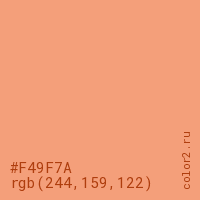 Цвет #F49F7A в цветовой модели RGB обозначается тремя октетами (244, 159, 122) в десятичном формате и #F49F7A в шестнадцатиричном (hex) формате, которые являются интенсивностью красного 244 (hex F4), интенсивность зелёного 159 (hex 9F) и интенсивность синего 122 (hex 7A).